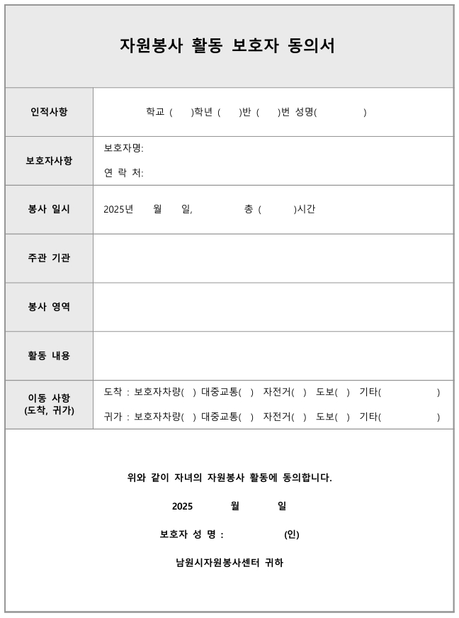 청소년 자원봉사 참여시 작성- 보호자동의서