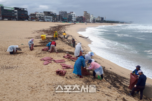 | | 17일 강릉지역 자원봉사자 50여명은 안목해변에서 18호 태풍‘미탁’과 19호 ‘하기비스’의 영향으로 해안에 밀려온 목재쓰레기·해초 수거작업을 진행했다. (제공=강릉시청) |